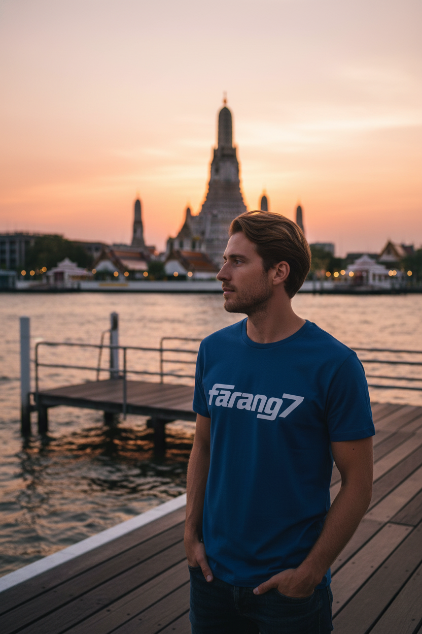 Le t-shirt Farang7 Bleu Royal incarne parfaitement la fusion entre les cultures française et thaïlandaise. Son bleu profond évoque à la fois le ciel de Bangkok et l’élégance décontractée parisienne.